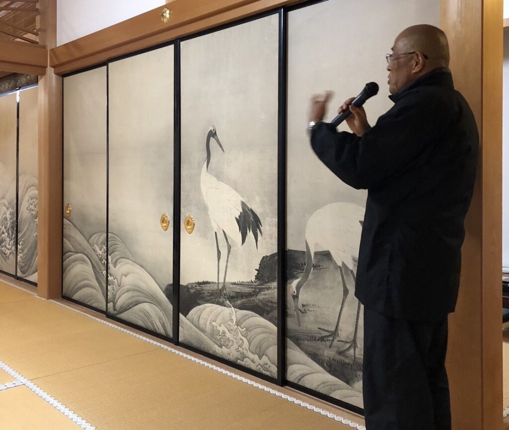 この展示は、従来の定説となる位置の襖を展開しただけですが、夏目漱石も小説で取り上げ、私もずっと試みたいと思っていましたが、本堂正面には鴨居や敷居がないため4枚の襖は立てる事ができません。