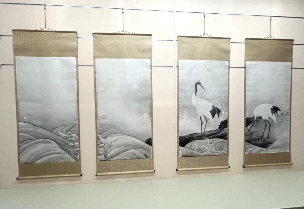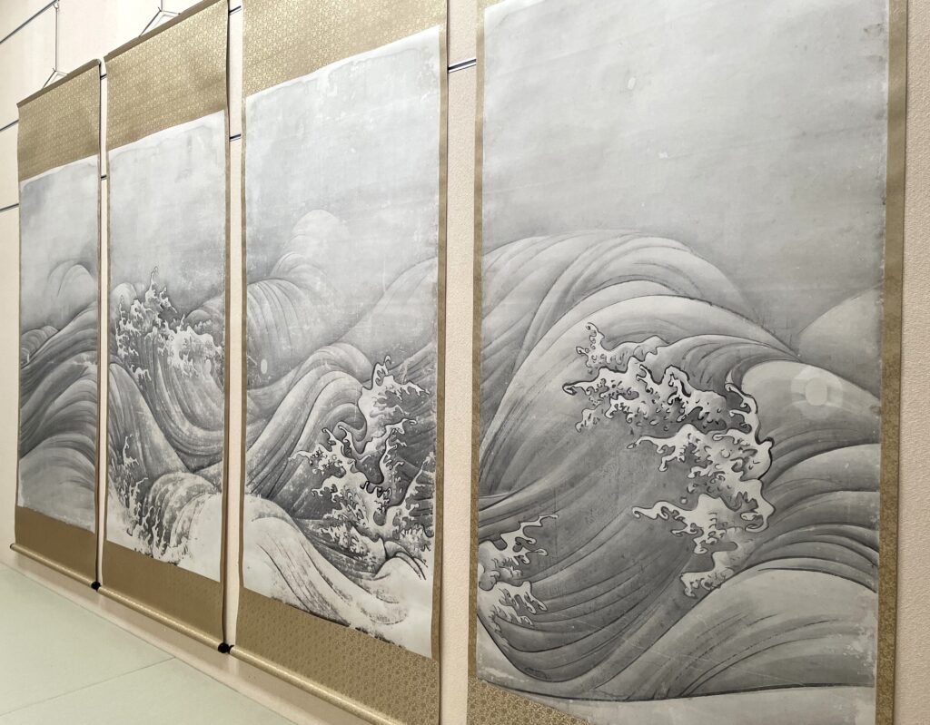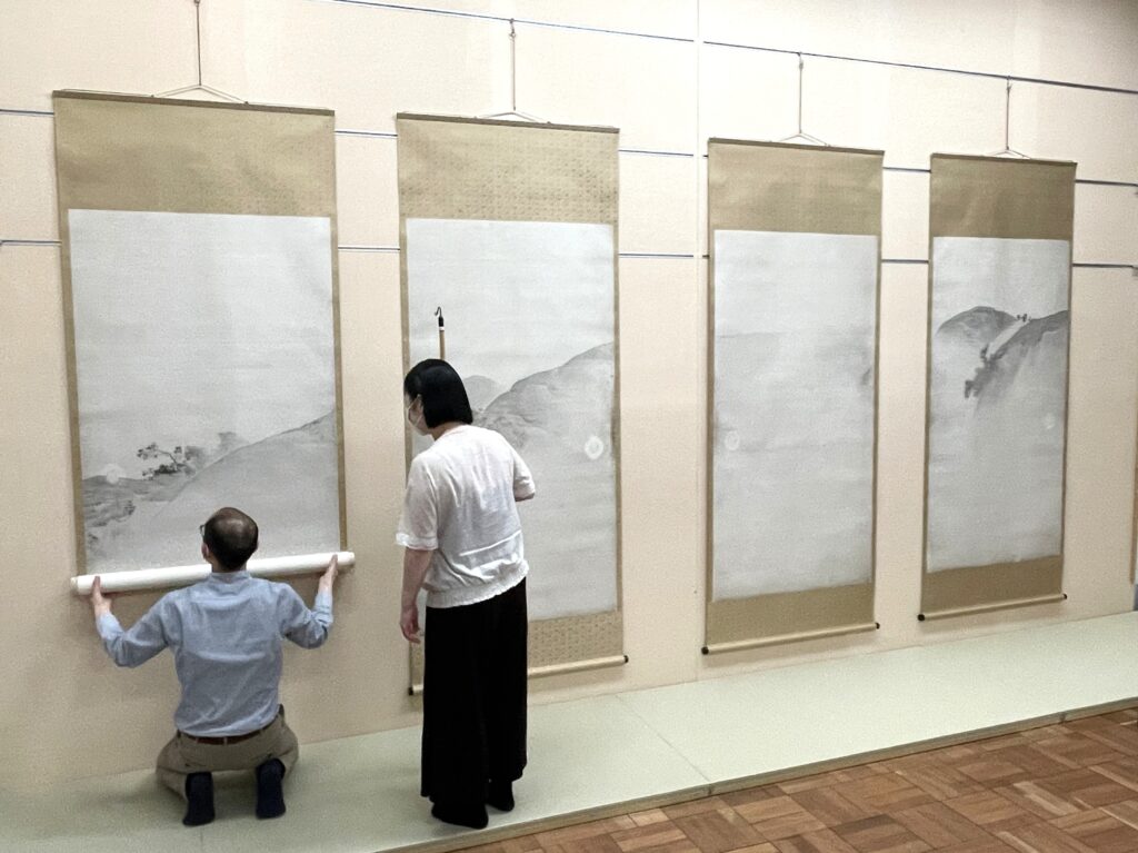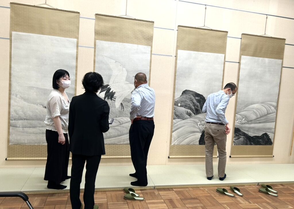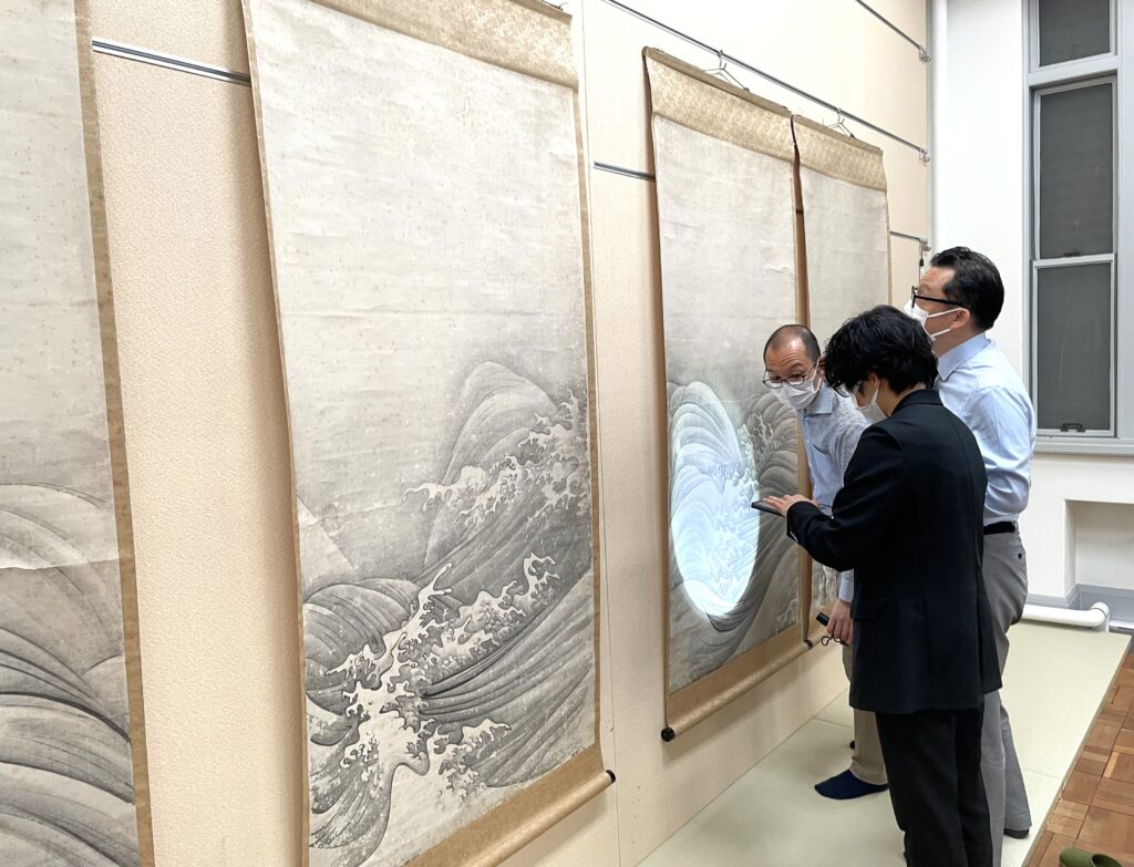 令和5年度から始まった重要文化財「波涛図」(32幅の内12幅)「山水図」(13幅の内4幅)の第1期前半の事業がこの程完了、京都国立博物館(文化財保存修理所)から寄託先の東京国立博物館に返送され、4月23日に地下の特別室で関係者が確認作業を行いました。